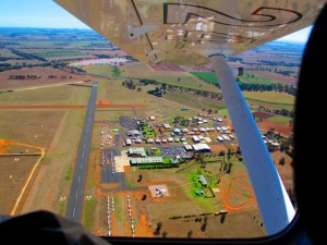 When Josh & I were landing in Temora, it was pretty exciting – there were about 10 planes in circuit & I had to avoid someone cutting in & I had to do a “go around”. It keeps you on your toes! I had Josh scanning the sky, pointing out where all the planes were, so I could concentrate on flying the plane. It was beautiful blue skies & we got a great view of the Natfly setup while coming in to land (see pic below).