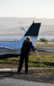 Michael wiping water off the wing of the Piper Lance